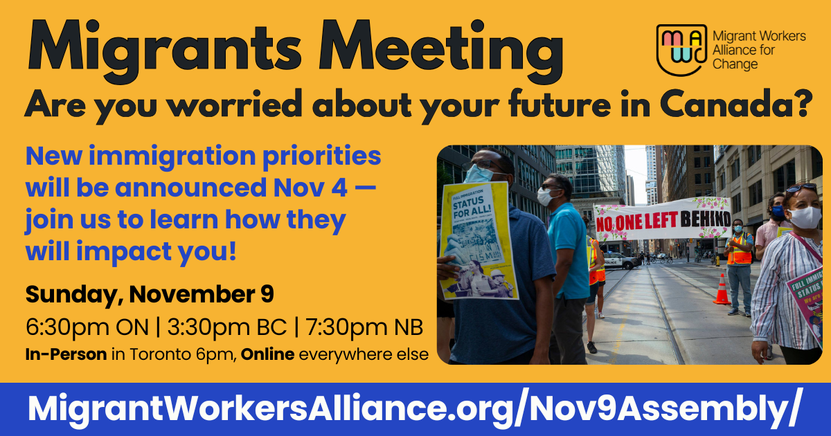 Join November’s Migrant Assembly to discuss all these updates and hear how migrants like you are taking action to fight the cuts. This assembly is led by migrants – don’t get scammed by immigration consultants and other people who want to make money off of our struggles by spreading misinformation.
